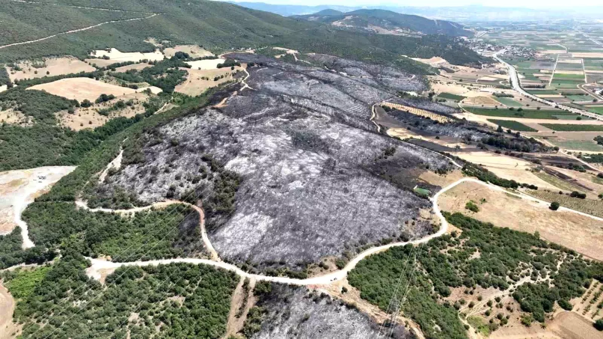 Bursa’nın Yenişehir ilçesine bağlı Marmaracık mevkiinde dün çıkan orman yangından sonra çekilen drone manzaraları zararın boyutunu gözler önüne serdi. 500 futbol alanı büyüklüğündeki yeşil alan simsiyah manzarasıyla yürekleri dağladı.