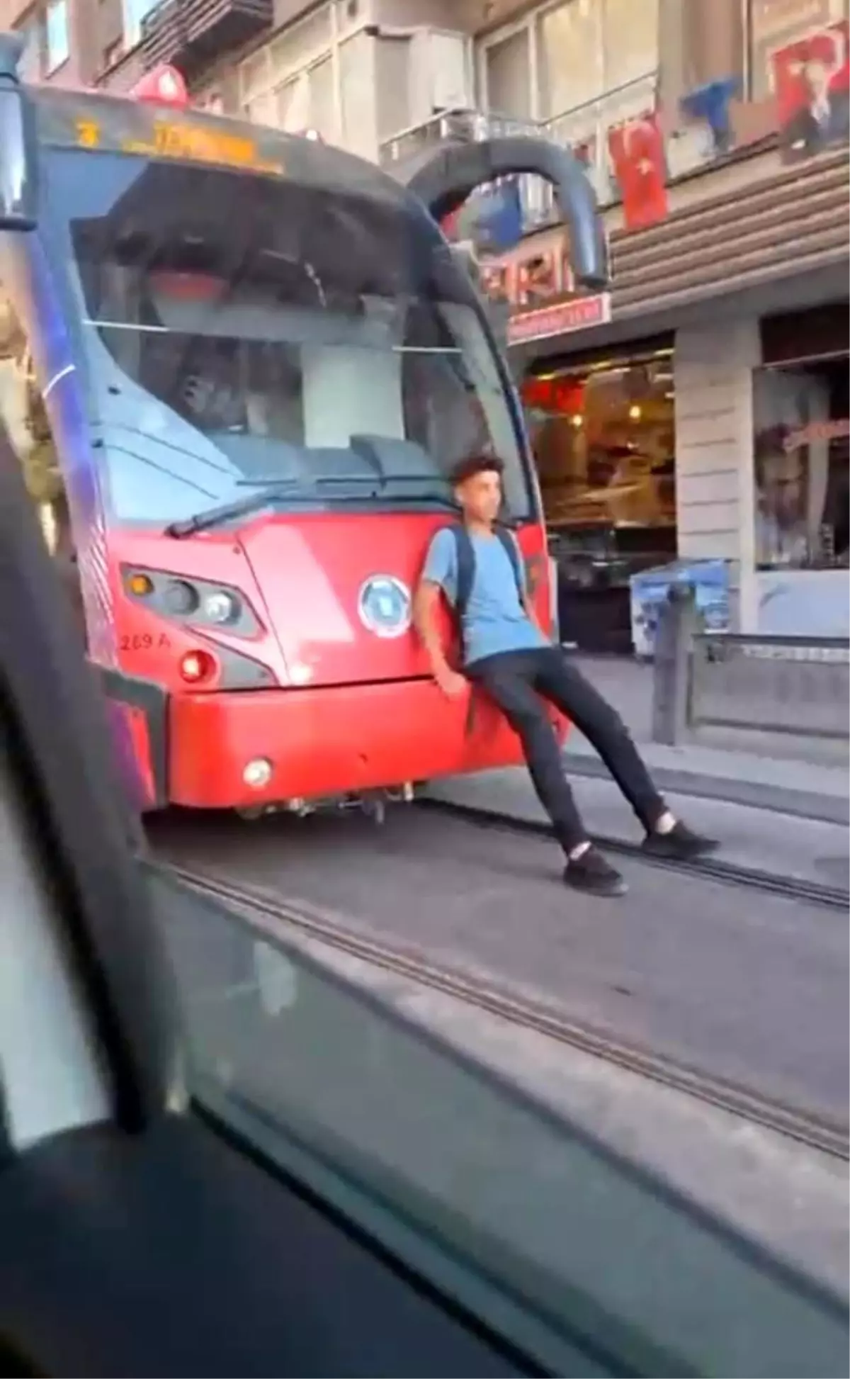 Yoğun trafikte, tramvayın art kısmına oturup ayaklarını yere sürterek tehlikeli bir biçimde seyahat eden çocuk, görenleri hayrete düşürdü. Çocuğun bu tehlikeli seyahati, trafikteki bir vatandaş tarafından cep telefonu kamerasıyla kaydedildi.