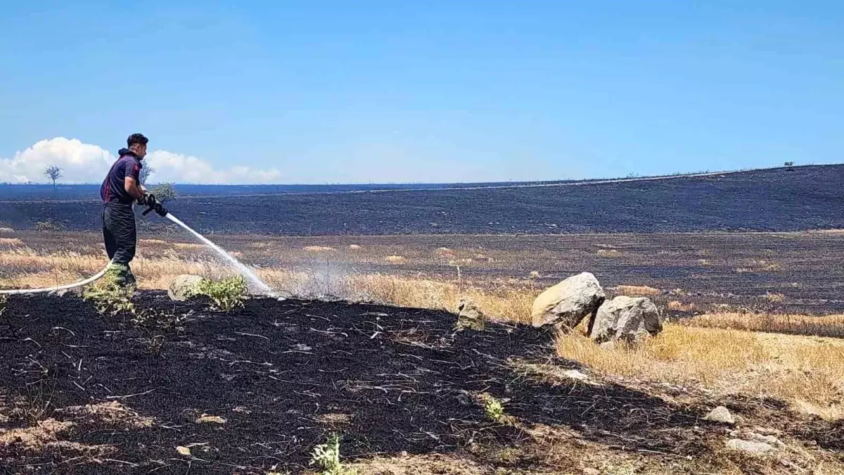 Yangın rüzgarın tesiriyle kısa müddette geniş bir alana yayılırken, bölgede yaşayan vatandaşlar da traktörleriyle yangının önünü kesmek gayesiyle tarlaları sürerek müdahaleye etti.