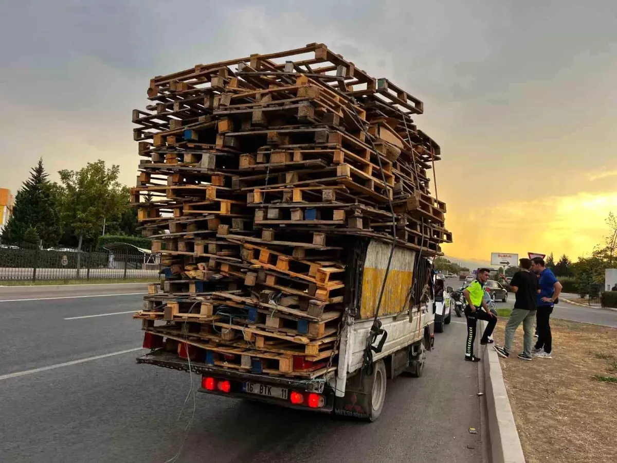 Bursa’nın İnegöl ilçesinde tehlikeli biçimde yük taşıyan kamyonetin şoförüne ceza yağdı.
