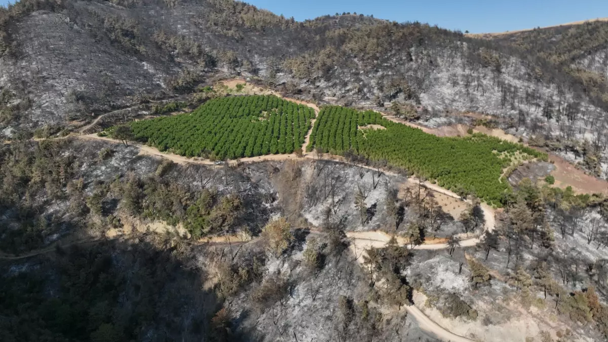 Hayatın olağana dönmesiyle birlikte köylülerin geçim kaynağı olan tarım alanlarındaki bir bahçesi ise dikkat çekti. 100 hektarlık ormanlık alandaki ağaçların hepsi küle dönerken, ormanın içinde Karahıdır Mahallesinde kalan nektarın bahçesi yemyeşil üzerinde meyveleriyle kala kaldı. Dikkat çeken bahçenin etrafındaki toprağın bile griye katmanla kaplanmışken, 2B çerçevesindeki Halil Kiraz’a ilişkin 25 dönümlük arazinin etkilenmemesi büyük sevinçle karşılandı.